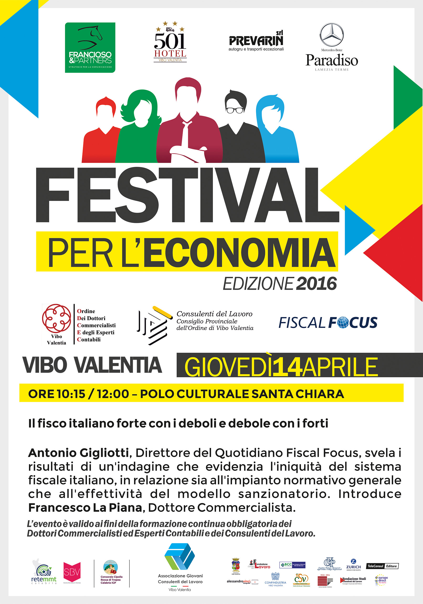 Personalità di alto rango a confronto sulle principali questioni, attorno alle quali gravita l'economia Internazionale. Il Festival dell'economia si prepara a dare avvio alla seconda edizione della kermesse, nell'ambito della quale sono attesi a Vibo Valentia, anche quest'anno città ospitante l’evento, alcuni tra i più importanti nomi del panorama economico Nazionale ed Internazionale. L'iniziativa, articolata in tre giornate (14, 15 e 16 aprile), sarà presentata nel corso di una conferenza stampa, in programma per lunedì 11 aprile, alle ore 11, a Vibo Valentia presso la sede del Sistema Bibliotecario vibonese in via Ruggero il Normanno. Il Festival vedrà gli esperti del settore pronunciarsi su tematiche specifiche (economia, lavoro, professioni e mercati) in venti incontri che accenderanno i riflettori sul Polo culturale “Santa Chiara” e sull'hotel “501”. L'iniziativa sarà illustrata alla stampa dai promotori della manifestazione: Alessandro De Salvo, referente Nazionale della scuola economica Mmt, Gilberto Floriani, Direttore del Sistema Bibliotecario vibonese, Vincenzo Greco dei Consulenti del Lavoro e Lionella Maria Morano della Fondazione “Liotti”. Oltre 50 personalità tra economisti, accademici, giornalisti, saggisti, imprenditori, che discuteranno di una serie di problematiche di stringente attualità, in campo economico e non solo. Sotto la lente d’ ingrandimento i limiti dell’euro-zona, il dramma dell'austerità, la spavalderia dei mercati finanziari, il sistema fiscale italiano, la valorizzazione del “Made in Italy”. Sullo sfondo i ritardi del Mezzogiorno, vittima del progressivo aumento della disoccupazione giovanile, determinato dalla mancanza di investimenti. Tornerà a Vibo, per il secondo anno consecutivo, il teorico della “Modern Money Theory” Warren Mosler. Accanto a lui molte altre illustri personalità, tra cui: Antonio Gigliotti, Maurizio Del Conte, Antonino Galloni, Pippo Callipo, Luciano Barra Caracciolo, Marina Calderone, Stefania Tamburello, Damiano Silipo, Antonio Maria Rinaldi, Cesare Pozzi, Luigi Ferrari, Angelo Bruscino.